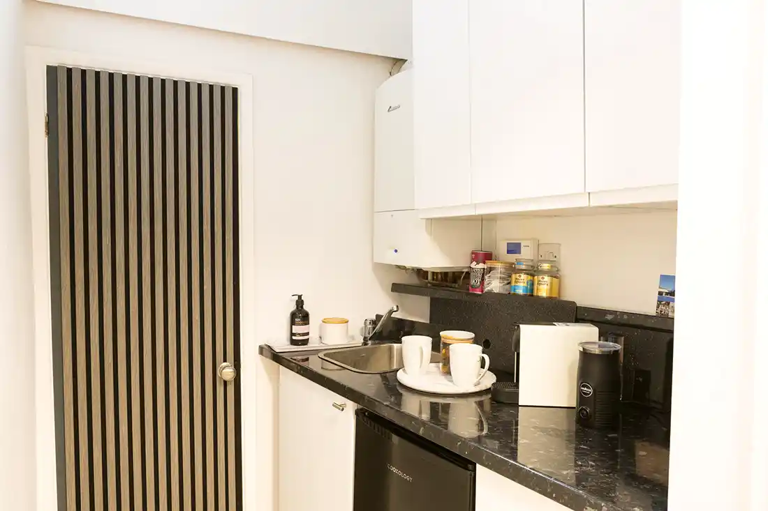 Our kitchenette is a welcoming space for therapists to pause between sessions, with complimentary tea and coffee, a Nescafé pod machine with milk frother, and a fridge for storing refreshments. There’s also a little sweet treat on hand — mini flapjacks and brownies — perfect for a quick pick-me-up between sessions.