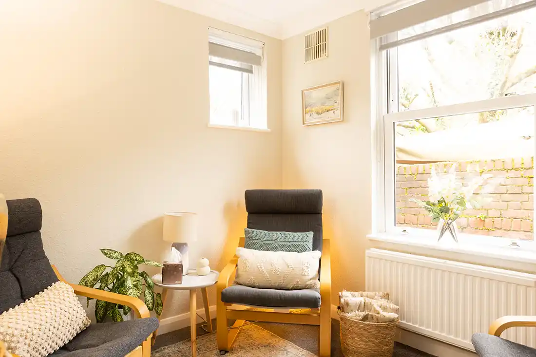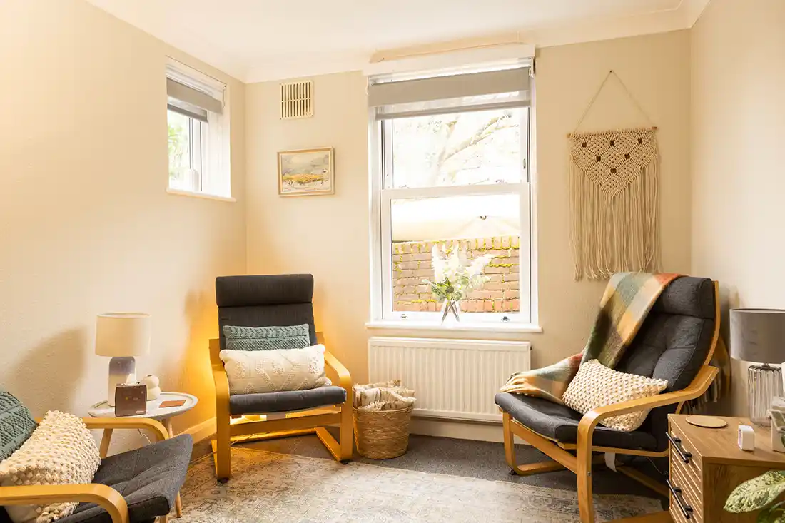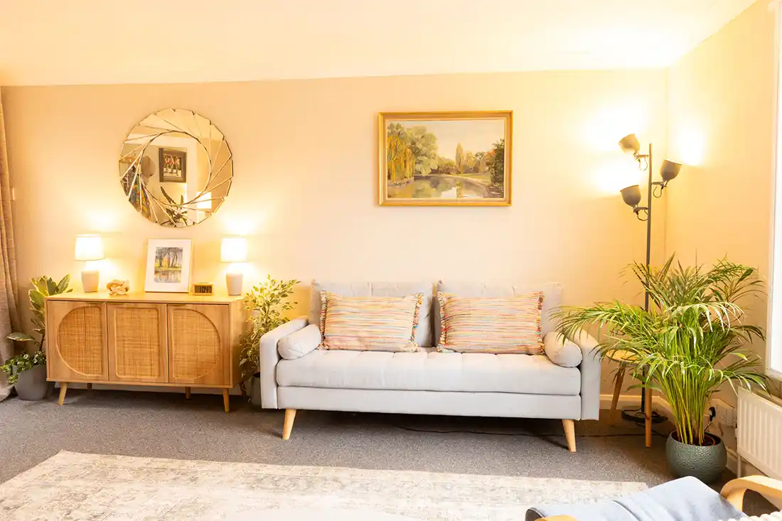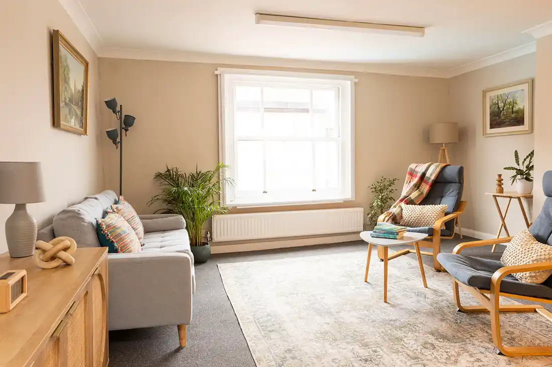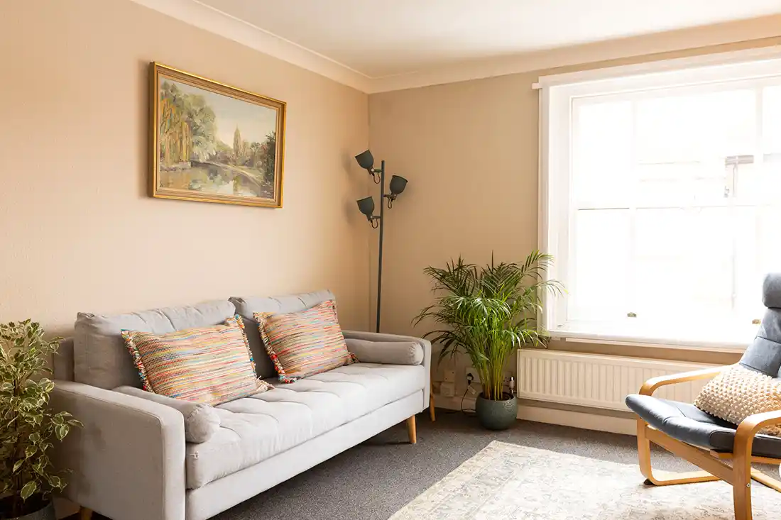 Located on the first floor, the room features an armchair and large three-seater sofa, making it well suited for individual sessions, as well as couples and family work. The mid-century décor, abstract artwork, and calm, neutral styling create a relaxed, grounding environment. With views onto Holywell Hill, Room 1 feels connected yet contained.