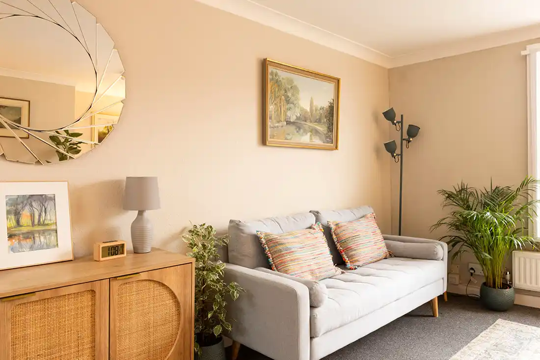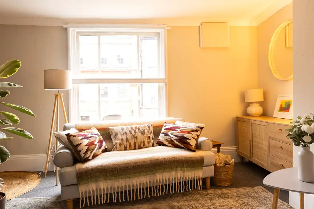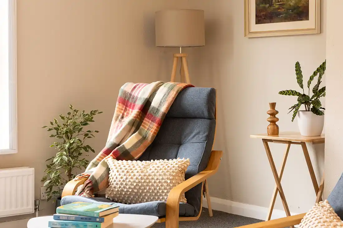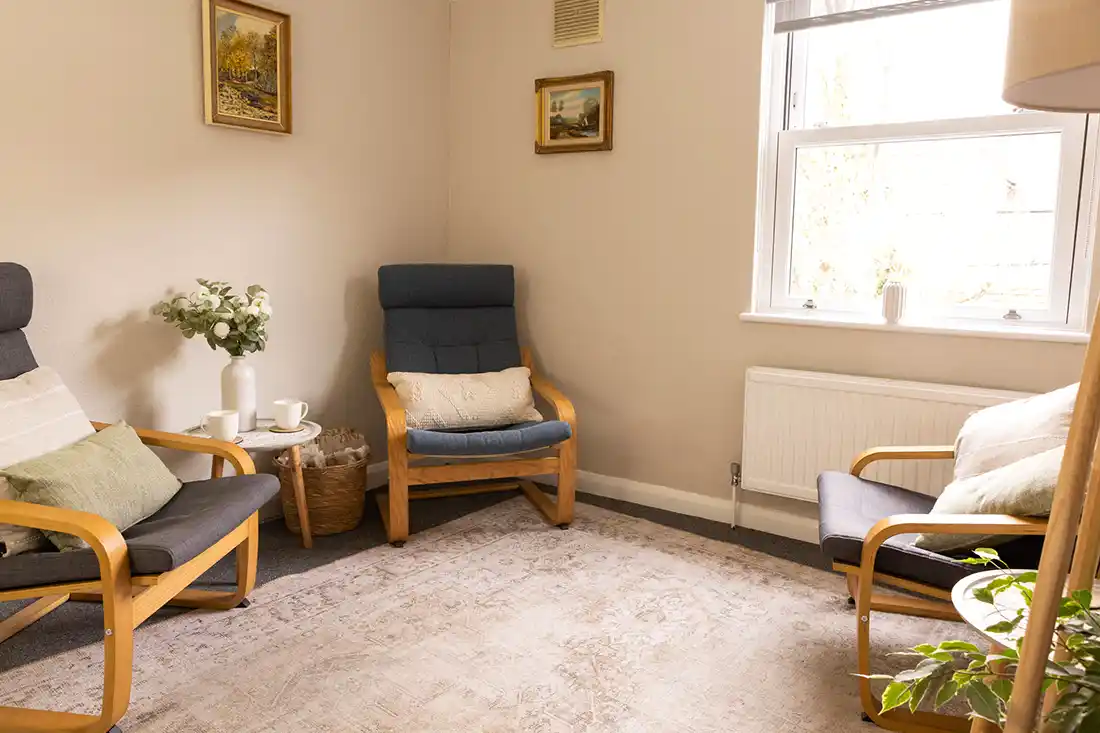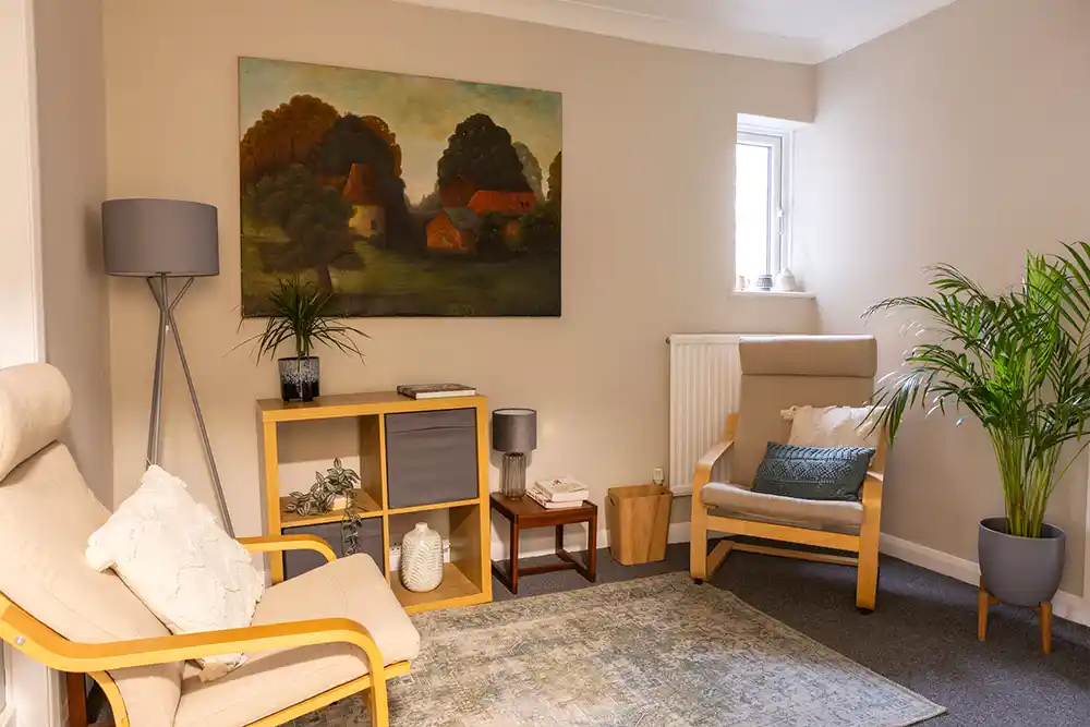 Located on the first floor, the room features an armchair and large three-seater sofa, making it well suited for individual sessions, as well as couples and family work. The mid-century décor, abstract artwork, and calm, neutral styling create a relaxed, grounding environment. With views onto Holywell Hill, Room 1 feels connected yet contained.