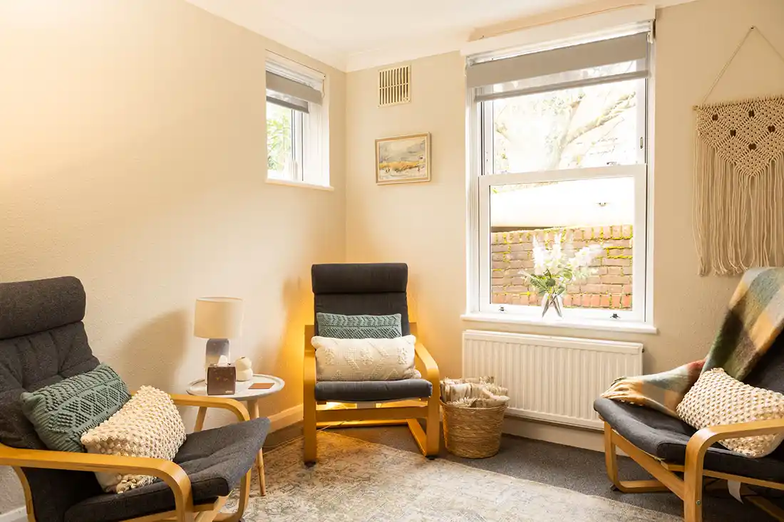 Ideal for one to one sessions, couples work and small groups. At just over 14 ft square, this spacious room has a three seater sofa and two comfortable armchairs.